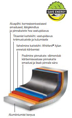 - Titaanikiht alumiiniumi ja kõrbemisvastase pinnakatte vahel tagab pealispinnale optimaalse hõõrdejõu.