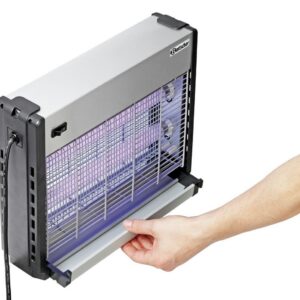 Upright unitMethod of killing insects Electric shock Effective radius 10 m Light output 2 x 10 W, UV-A lamps Power 0.033 kW Voltage 230 V Frequency 50/60 Hz Colour Silver