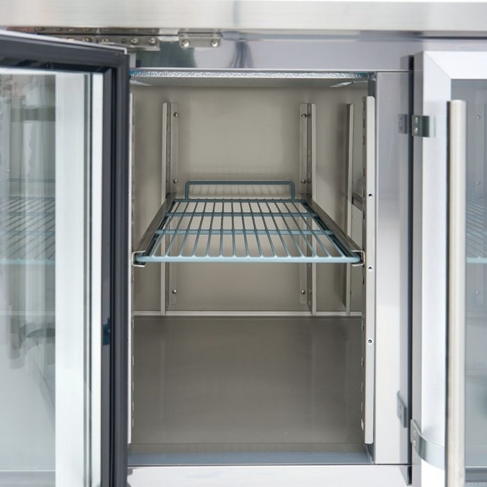 Töölaua-külmiku sisemus on varustatud LED-valgustusega, mida saab vastavalt vajadusele sisse või välja lülitada. Seadmel on neli resti, mille suurus on 1/1 GN. Ruutude disain ja kõrgendatud serv tagaküljel võimaldavad head õhuringlust. Kõrgendatud serv takistab toidu kukkumist või tagaseina külge kleepumist. Ruudud on paigaldatud reguleeritavatele juhikutele, mille kõrgust saab reguleerida 5 cm kaupa, mis võimaldab kõige tõhusamat paigutust. Saate lisada ka 1/1 Gastronormi mahuteid, mis on ideaalsed lahtiste koostisosade või valmistoitude jaoks. See letikülmik on paigutuse poolest väga paindlik. Võite tellida lisaruudustikke või eri suurusega GN-konteinereid eraldi juhenditega meie veebisaidilt.