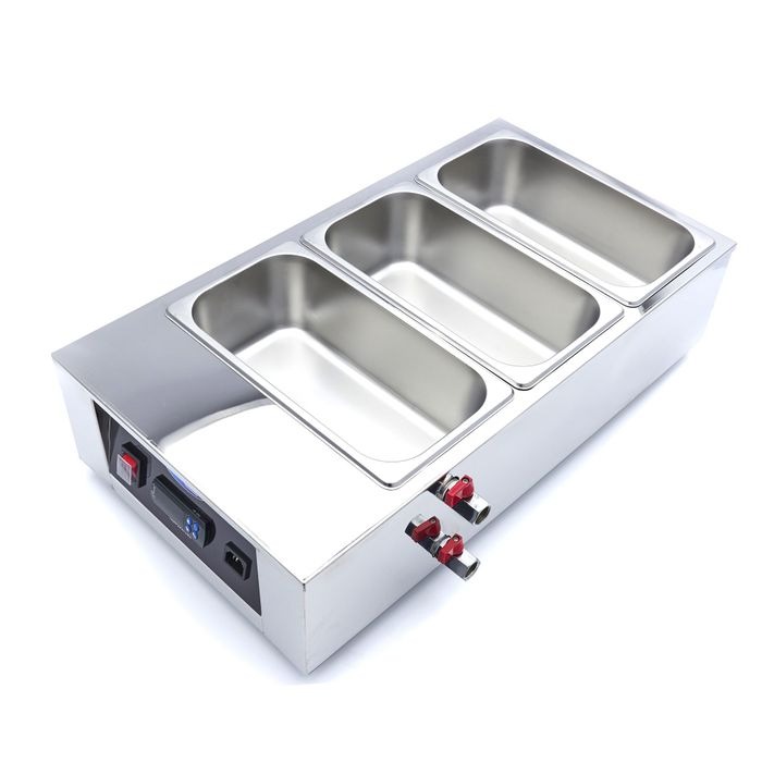 See roostevabast terasest šokolaadisulataja on varustatud 3 tk 1/3 GN mahutiga ja sobivate kaanetega. Sellel on 4 kummist jalga, mis hoiavad seda kindlalt pinnal. Näidik on hõlpsasti kasutatav ja koosneb sisse/välja lülitamise nupust ning digitaalsest temperatuuriregulaatorist. Noolenuppude abil saate soovitud temperatuuri seadistada ja digitaalne ekraan võimaldab teil kuumutamise kulgemisel silma peal hoida. Temperatuur on reguleeritav ühe kraadi kaupa vahemikus 3 kuni 100°C. Šokolaadisulatajal on kraan, mille abil saate šokolaadisulatajat hõlpsasti tühjendada. Šokolaadisulatajal on ka auru väljavooluklapp. Nii saab vee kuumutamisel tekkinud auru seadmest hõlpsasti välja lasta.