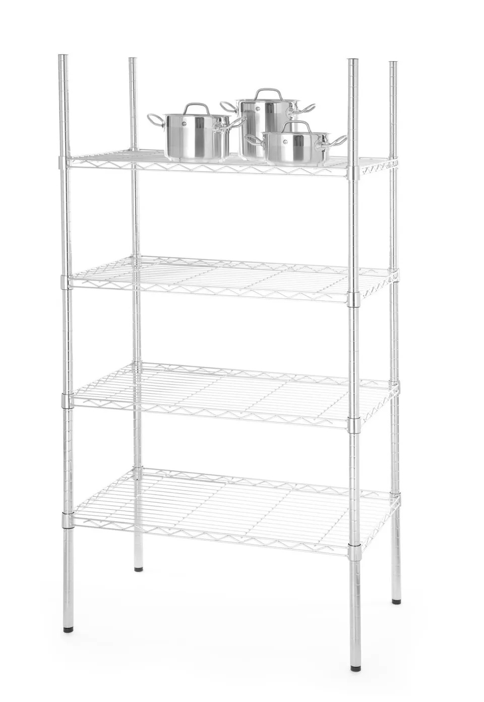 Kroomitud. 4 reguleeritavat riiulit, maksimaalne kandevõime riiuli kohta 80 kg. Reguleeritavad jalad. Ise kokkupanemiseks. Kohaletoimetamine lamedas pakendis