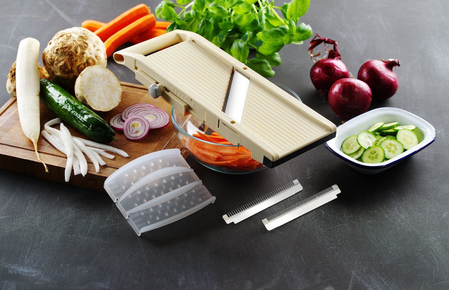 Jaapani mandoliin HENDI Shōgun 将軍 – kvaliteetne tööriist, mis on valmistatud Jaapanis. See tagab lõike, mis on võrreldav professionaalsete nugadega, kuid lõikab viilud, ribad või dekoratiivsed elemendid alati täiuslikult ja kiiremini.
