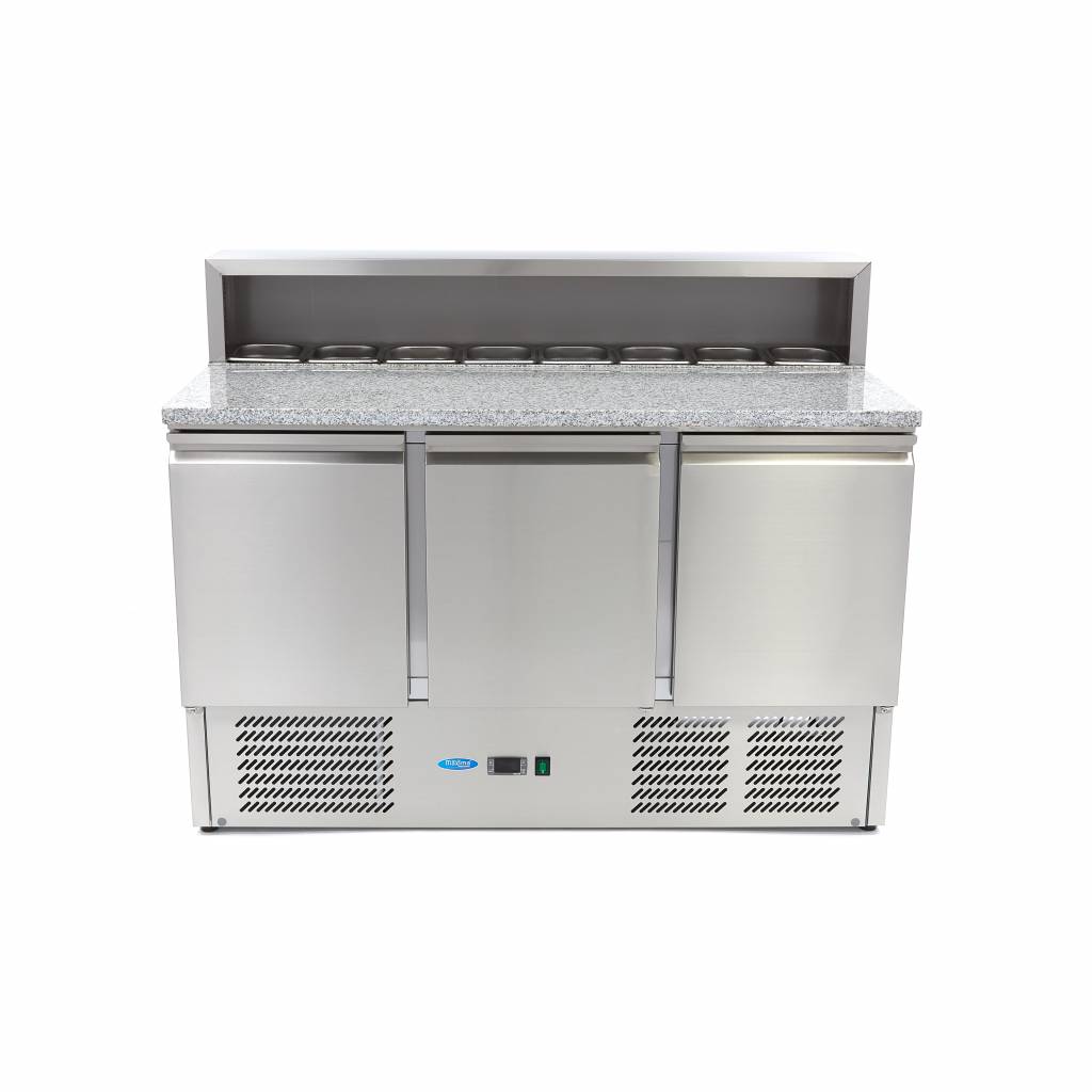 Kena luksusliku viimistlusega pitsalaud roostevabast terasest konstruktsiooniga koos graniidist tööalaga. Mahutavus 8 x 1/6 GN. Varustatud roostevabast terasest ülaosaga.