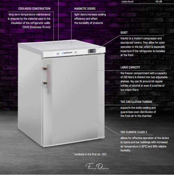 Kaasaegne ja kompaktne sügavkülmik on hädavajalik varustus iga baari ja kohviku jaoks. See on valmistatud väljast roostevabast terasest ja seest tugevast ABS-plastikust, mis muudab selle vastupidavaks ja hõlpsasti puhtaks. Esteetilist väärtust tugevdavad lisaks sinine valgustatud juhtlüliti pealüliti ja uks koos elegantsete külgkalletega. Seade on varustatud digitaalse termostaadiga, mis võimaldab teil hõlpsalt, kiiresti ja täpselt määrata temperatuuri sügavkülmikus. See vähendab käitamiskulusid, stabiliseerib jahutusväärtust ja suurendab ladustatud toodete kasulikkust.