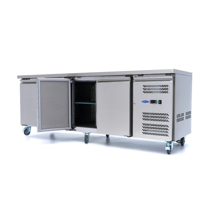Töölaua külmkapi uksekummid on soojendusega, et vältida uste külmumist. Uksed sulguvad magnetilise uksetihendi abil, mis takistab nende kogemata avatuks jäämist. 223 cm pikkune letikülmik on väga suur, kuid tänu all olevatele ratastele on seda lihtne liigutada. Esirattad on varustatud piduriga, mis võimaldab teil hoida letikülmikut paigal. Töölaud on ideaalne toidu või maitsvate roogade valmistamiseks – kõik koostisosad on käeulatuses.