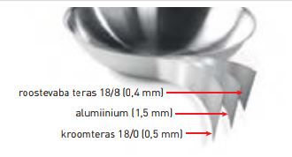 • Vokkpann 3-ply – see on 3-kihiline süsteem: roostevaba teras 18/8 (0,4 mm), alumiinium (1,5 mm), kroomteras 18/0 (0,5 mm).