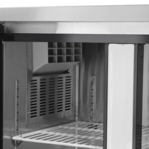 Töölaua-külmiku sisemus on varustatud LED-valgustusega, mida saab vastavalt vajadusele sisse või välja lülitada. Seadmel on neli resti, mille suurus on 1/1 GN. Ruutude disain ja kõrgendatud serv tagaküljel võimaldavad head õhuringlust. Kõrgendatud serv takistab toidu kukkumist või tagaseina külge kleepumist. Ruudud on paigaldatud reguleeritavatele juhikutele, mille kõrgust saab reguleerida 5 cm kaupa, mis võimaldab kõige tõhusamat paigutust. Saate lisada ka 1/1 Gastronormi mahuteid, mis on ideaalsed lahtiste koostisosade või valmistoitude jaoks. See letikülmik on paigutuse poolest väga paindlik. Võite tellida lisaruudustikke või eri suurusega GN-konteinereid eraldi juhenditega meie veebisaidilt.